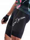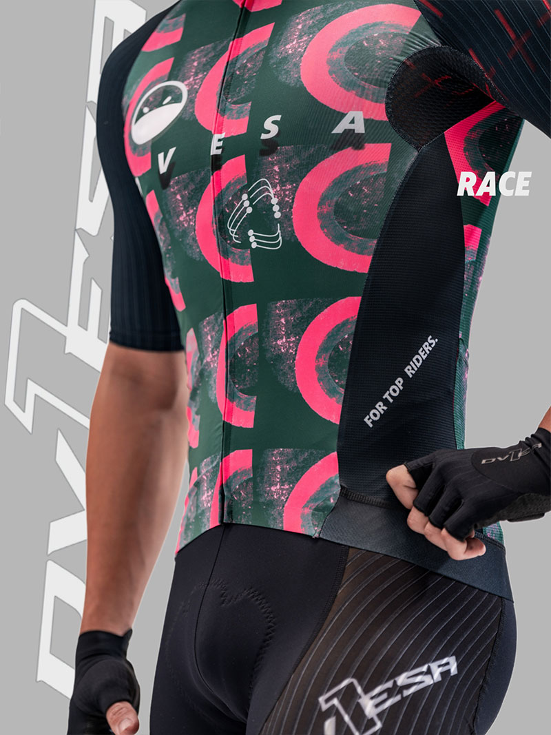 前肩带:采用更具用支撑性的法国面料,根据骑行姿势角度设计,增强骑行舒适度。肩带拼接位置使用压胶条的双重保护,减去缝线在长时间运动下对皮肤的刺激。
