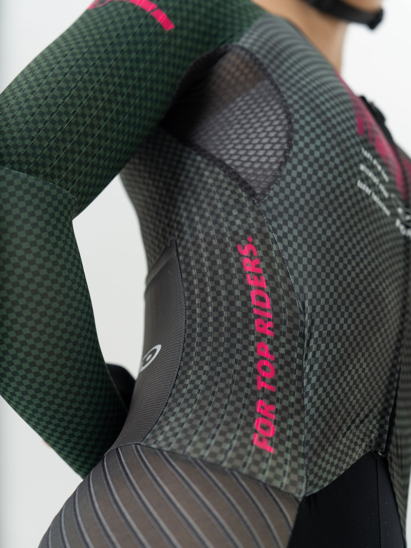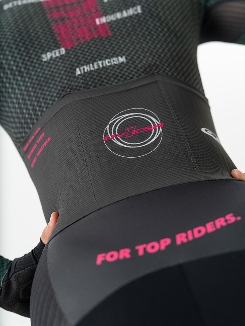 后片侧片相结合:整片剪裁无拼接,腰部与后背浑然一体,给与核心更强的支撑性和气动效果。同时腋下单独的分区起到更好的透气性及散热设计,保证更加贴合。
